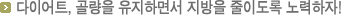 3개월간 다이어트로 5 ~ 6㎏을 감량한 사람의 골량을 조사하면 뚜렷한 골량 감소를 알 수 있다. 다이어트가 골량을 감소시키는 것이 아니라 칼슘의 부족상태가 골량을 감소시킨다. 이 점을 고려하여 다이어트시 골량을 유지하면서 지방을 줄이는 방법을 연구해야 한다. 방법은 칼슘과 단백질을 충분히 섭취하고 지방과 탄수화물을 적극적으로 줄이면 해결이 된다. 이런 사항을 배려하여 식단을 만들고 무리한 다이어트를 피하도록 한다. |