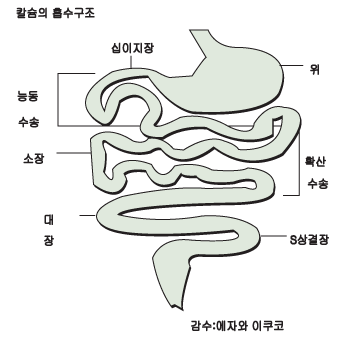 전자인 능동수송은 활성형 비타민D가 칼슘흡수를 촉진하는데 칼슘섭취량이 많으면 일정량 밖에 흡수하지 못한다. 하지만 후자인 소장하부 확산수송은 능동수송에서 흡수하지 못한 분량도 장시간에 걸쳐 서서히 흡수작업을 하기 때문에 칼슘 섭취량이 많아도 흡수량에 문제는 없다.