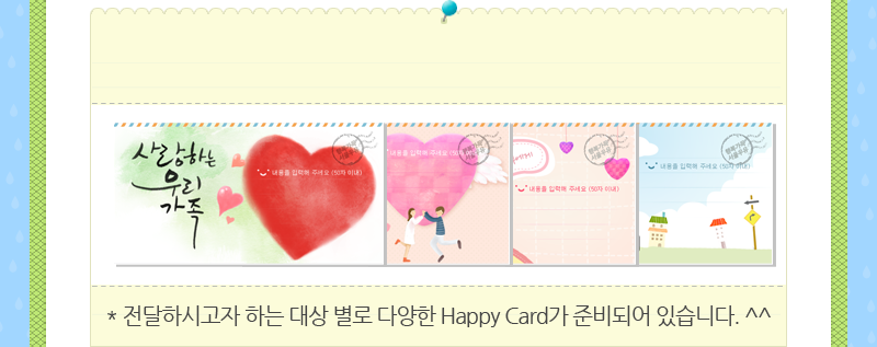 참여 방법- 내 맘에 쏙!드는 Happy Card 선택!, 전달할 SNS 및 친구 선택!(카카오톡, 페이스북, 트위터), 두근두근♥ 당첨자 발표 확인!